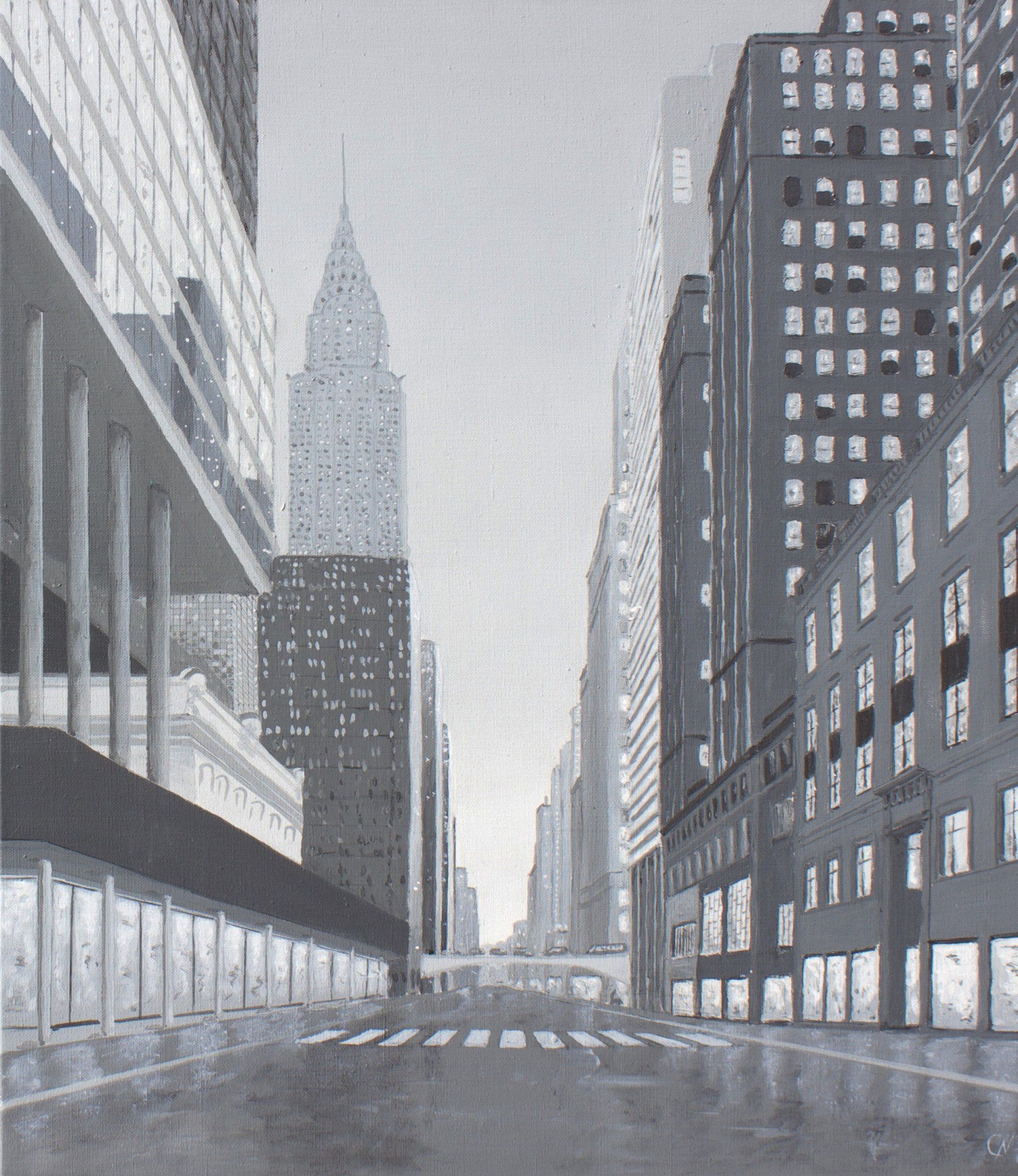 Le fond, travaillé à la brosse, joue sur des tonalités de blanc ou de gris à l’acrylique.