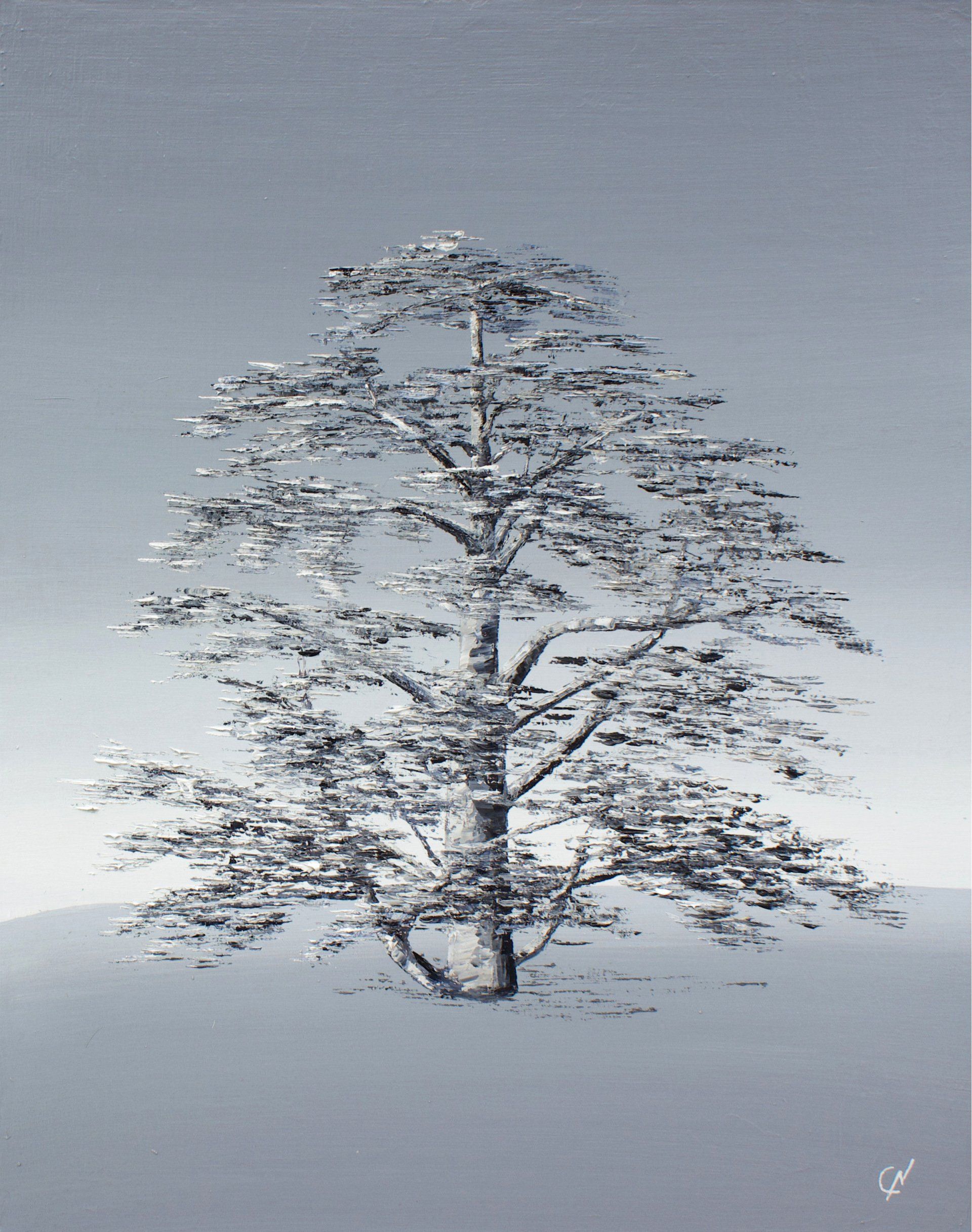Les arbres, sculptés au couteau avec l'huile, incarnent une quête d'arbre de vie.